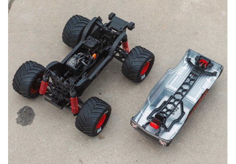 The QUAKE GROM 4X4 RTR Monster Truck body snaps onto the chassis easily, quickly, and securely, and comes off with a simple press-and-release. With no tiny clips to force into place, it's a body attachment system that's perfect even for young bashers.