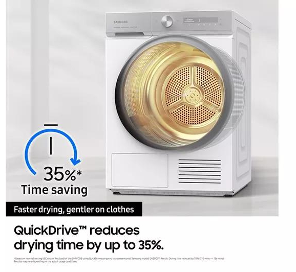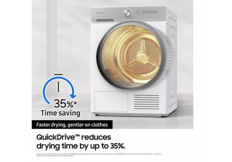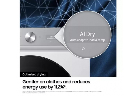 The Samsung tumble dryer DV90BB9445GB/S1 with AI Dry and QuickDrive uses intelligent sensors to analyse moisture levels and fabric types, automatically adjusting drying time and temperature. This ensures garments are dried thoroughly without damage, preserving fabric integrity and reducing energy waste. AI Dry also learns your laundry habits over time, prioritising frequently used cycles for quicker access. Combined with QuickDrive, which shortens drying time for 3kg loads to just 81 minutes, this dryer offers a smart and efficient solution for busy households.