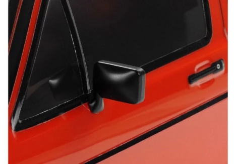Separate plastic parts moulded in black depict side mirrors and bumpers
