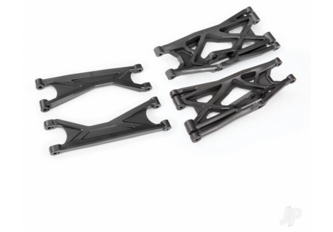 The vehicle is constructed upon a heavy-duty modular composite chassis with interlocking front and rear bulkheads. A fixed motor mounting system with rigid aluminium motor mounts secures the motor directly to the rear bulkhead to reduce chassis flex at the gear mesh. Suspension control is provided by four oil-filled Aluminium GTX Shocks, which feature machined aluminium threaded bodies and 5.2 mm damper shafts. These connect to heavy-duty suspension arms that utilise double-shear connections and high-strength steel suspension pins throughout their assembly. Directional control is actuated by a high-output, metal-gear steering servo which produces 450 oz-in of torque. The chassis is equipped with 8.6-inch belted chevron-pattern tyres; their internal belting is designed to reduce ballooning during high-speed operation.