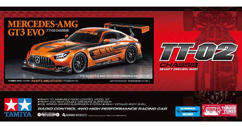 Tamiya welcomes another racing car – this time, the Mercedes-AMG GT3 EVO – paired with our popular TT02 chassis. The Mercedes-AMG GT3 EVO was developed for GT3 races in 2020. Using the previous model as a base, a 6.3-litre V8 engine capable of 550hp is employed and aerodynamics are improved across the board. It has an automatic data logging system for racing analysis, and the engine automatically starts once the car is drop started from its air jacks. Also providing top level safety, this car has been used by racing teams around the world.