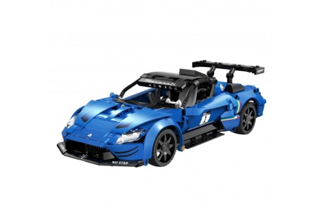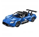A detailed self-build brick model of the Maserati GT2 racing car with blue and black colour scheme. This model features printed pieces (without stickers) and manual driving, making it ideal for play and display alike.