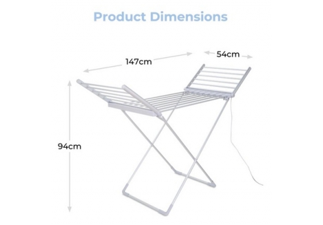 Practical dimensions—Height 94 cm, Width 147 cm, and Depth 54 cm—make the Tower T25003 Heated Winged Airer Silver accessible during hanging and collecting, reducing bending and awkward reaches. The span accommodates longer items like trousers and towels, while the height aligns with average waist level for ergonomic loading. When folded, the slim profile supports tidy storage and quick redeployment. These proportions ensure the Tower T25003 Heated Winged Airer Silver is easy to use for both small and large laundry sessions.