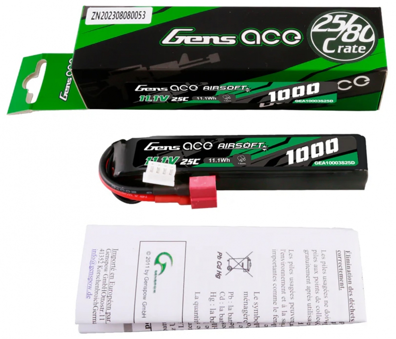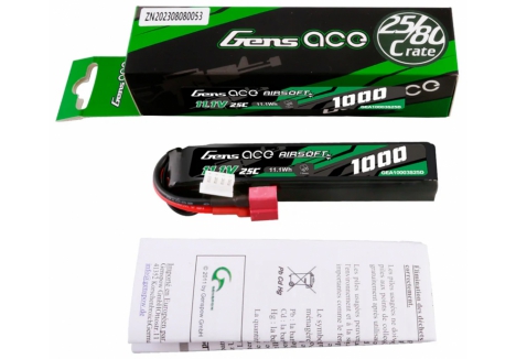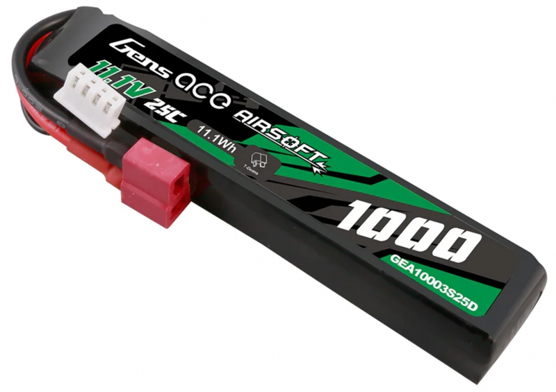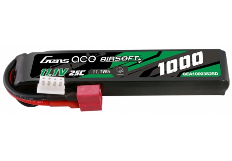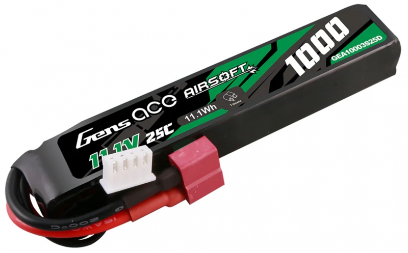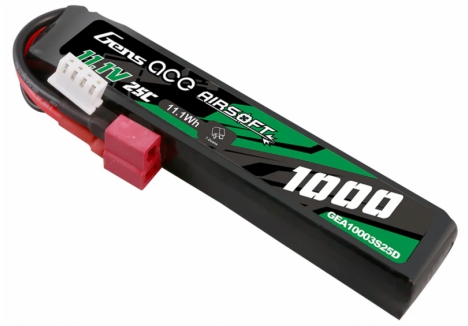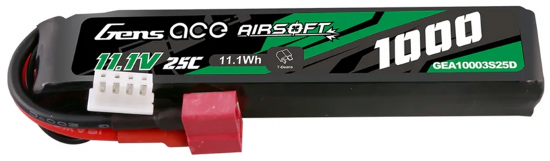 Gens ace 25C 1000mAh 3S1P 11.1V Airsoft Gun Lipo Battery with T Plug is designed specifically to power airsoft gun.