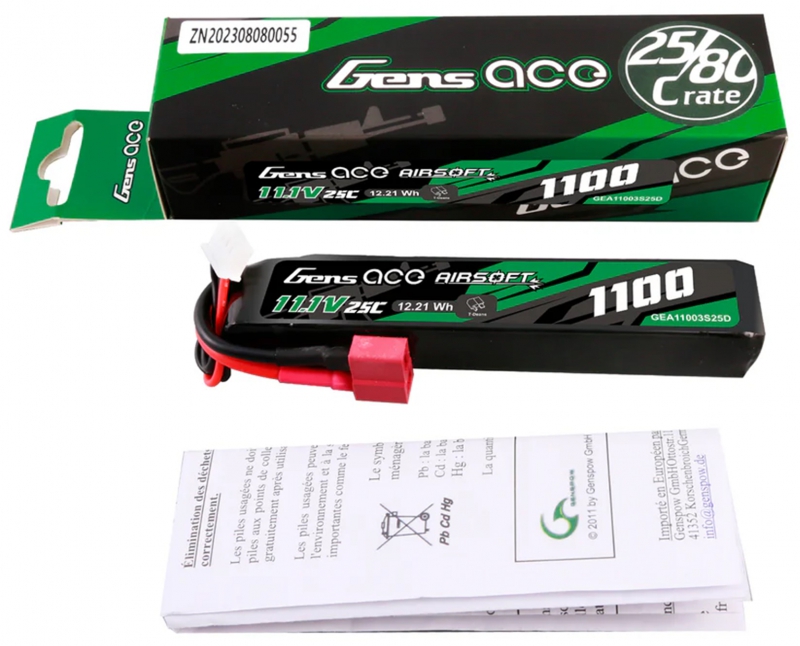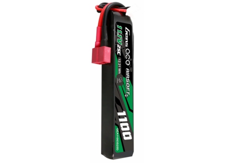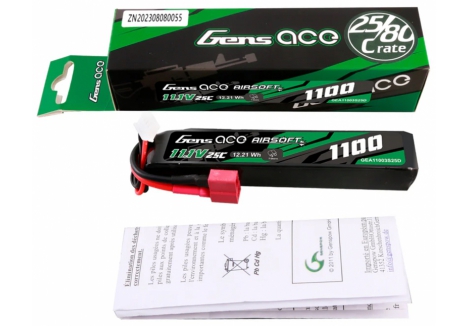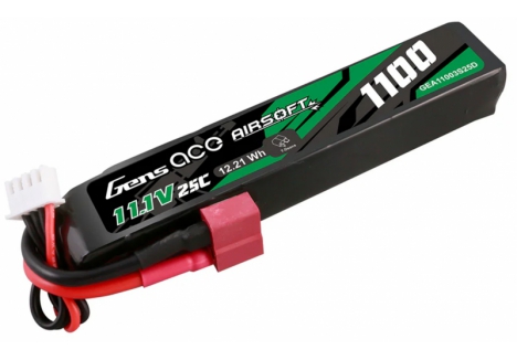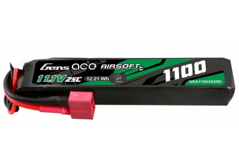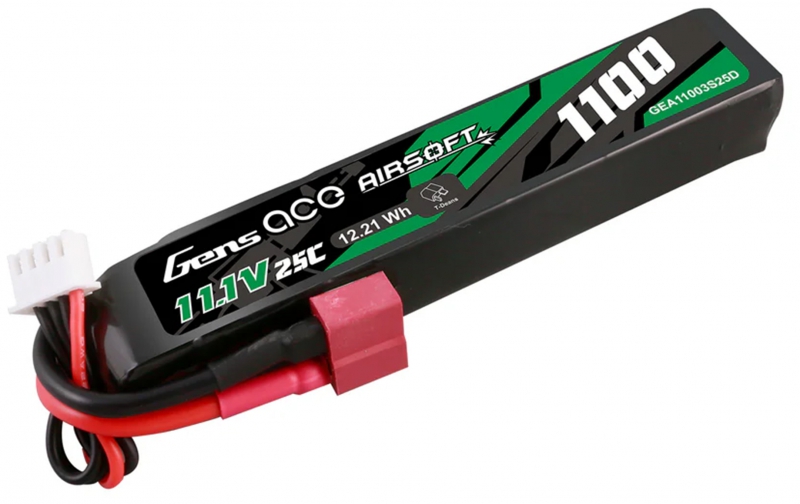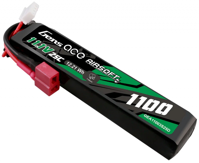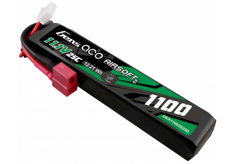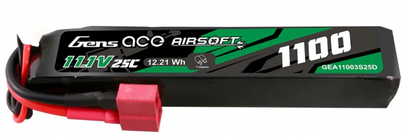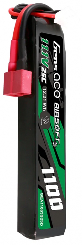 Gens ace 25C 1100mAh 3S1P 11.1V Airsoft Gun Lipo Battery with T Plug is designed specifically to power airsoft gun. Suitable for buffer tubes and AEG's where battery space is limited without sacrificing power and fits for LE stock like M4 etc.