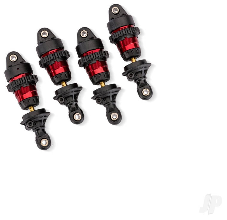 Give your mini the ultimate suspension upgrade with aluminium GTR shocks. The brilliantly-anodised aluminium shock bodies are coated with PTFE for the slickest damping action available. Their large bores hold more oil than standard shocks for conistent dampening over the roughest terrain. Slick titanium-nitride coated shafts resist scuffing, increase durability, and eliminate "stiction." X-rings keep oil in and dirt out for smooth suspension action. Spring preload and ride height changes are as simple as turning the threaded spring collars. The lower spring retainers even feature a locking screw to prevent annoying pop-off in the middle of your run. Silicone oil is included in the package. Sold as a complete set of four.