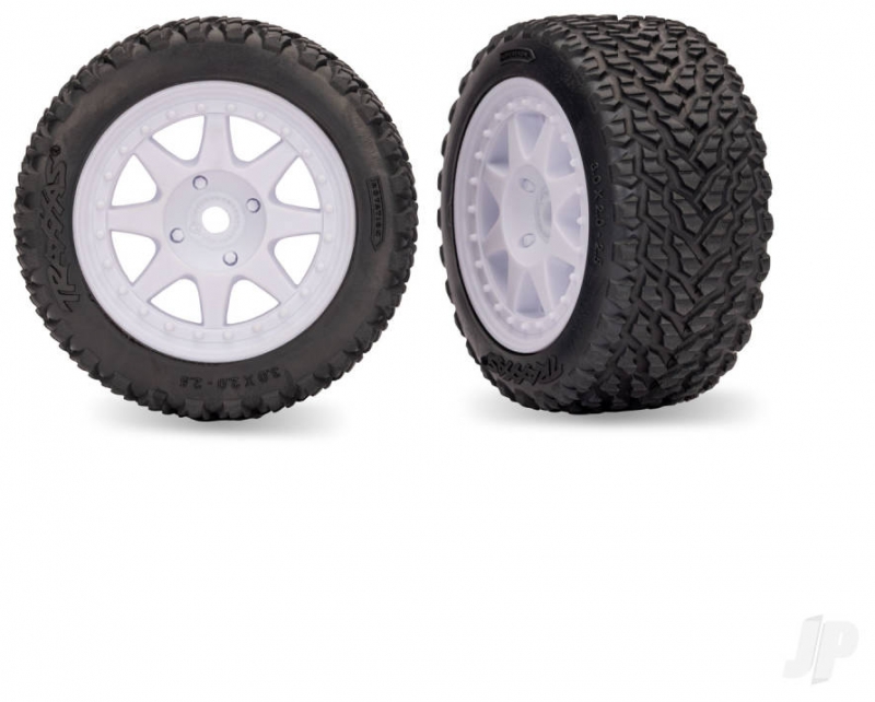 Mini Rally rear tires are softer than the front tires to maintain Rally's superior handling and balance. Mini Rally tires offer excellent traction on pavement, dirt, gravel, and more with a unique directional tread pattern. Tires come pre-glued and mounted to white 8-spoke Rally wheels. Sold as a pair. Fits 12 mm hex, rear position.