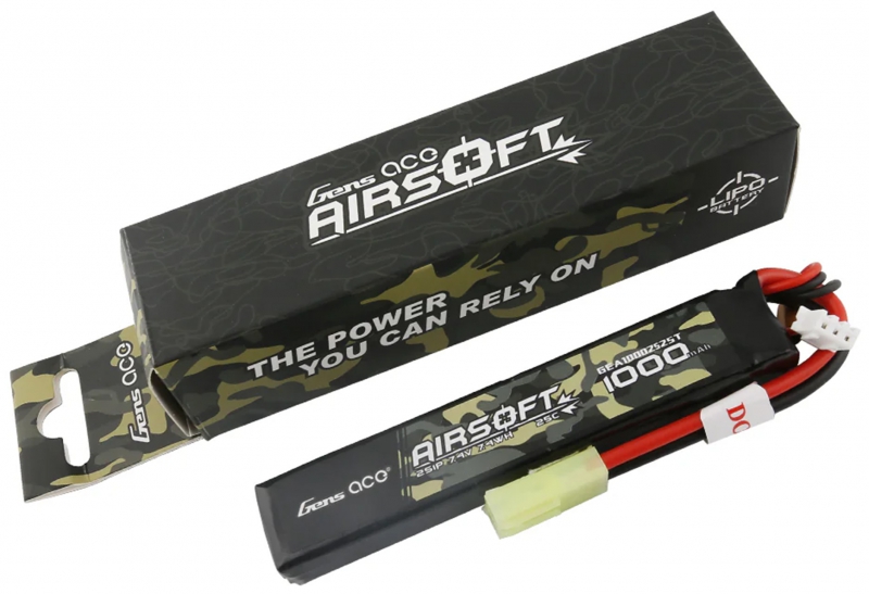 Gens ace 25C 1000mAh 2S1P 7.4V Airsoft Gun Lipo Battery with mini Tamiya Plug is designed specifically to power airsoft gun.