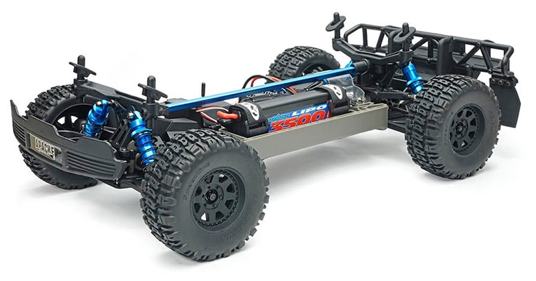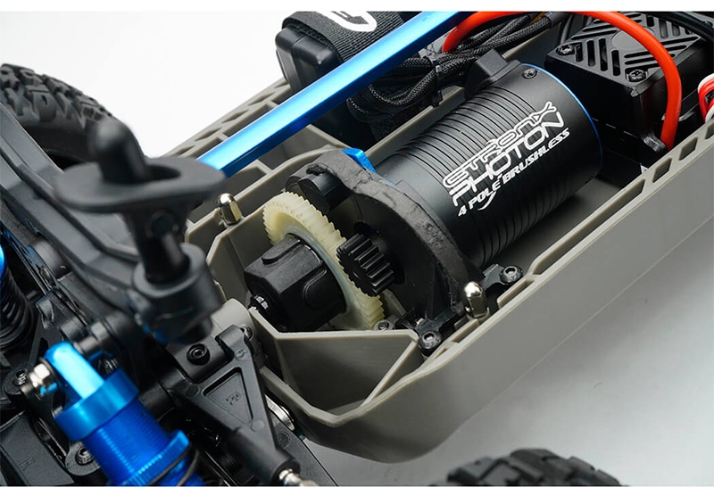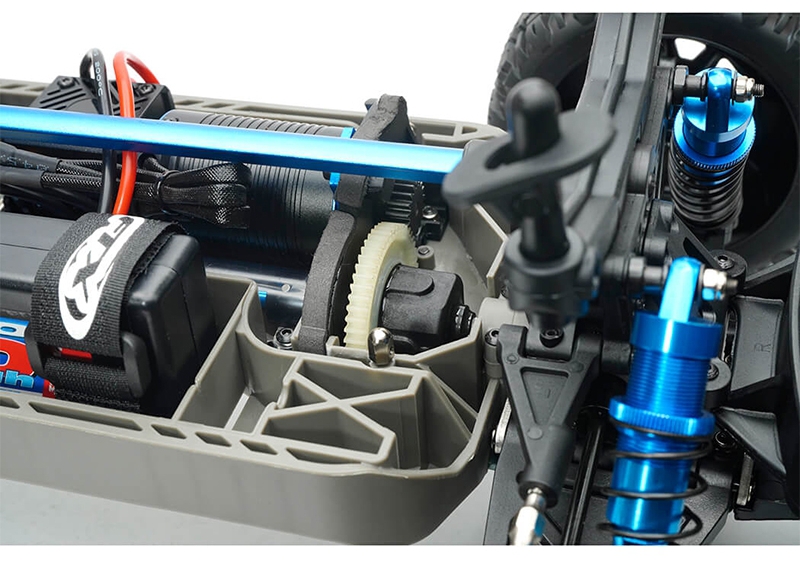 Powering the sealed, shaft-driven 4WD system is a Voltz 3S LiPo battery, Hobbywing 50A speed controller now with XT60 connectors and an Etronix 2500KV brushless motor, providing exhilarating high-speed performance across dirt, gravel, and rough terrain.