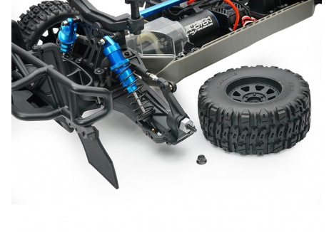 Aggressive block-pattern soft race tyres mounted on black 8-spoke wheels ensure maximum grip and authentic Trophy Truck stance.