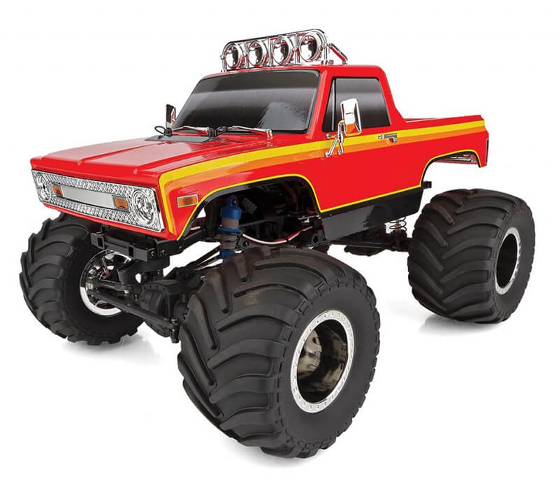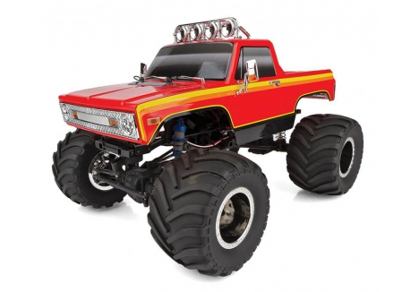 Designed not only for scale looks with realistic chrome wheels, chevron-style tires, and retro-styled monster truck body, the MT12 is built for car-stomping action as well. The steel ladder frame chassis provides the perfect backbone for this rugged little monster. The 4-link suspension, threaded shocks, and soft rubber tires give the grip and performance needed to smash over cars or through dirt and mud. Transferring power to the ground is a compact 3-gear transmission, plastic low-friction slider-type drive shafts, front steel CVA axles, and metal-shield ball bearings.