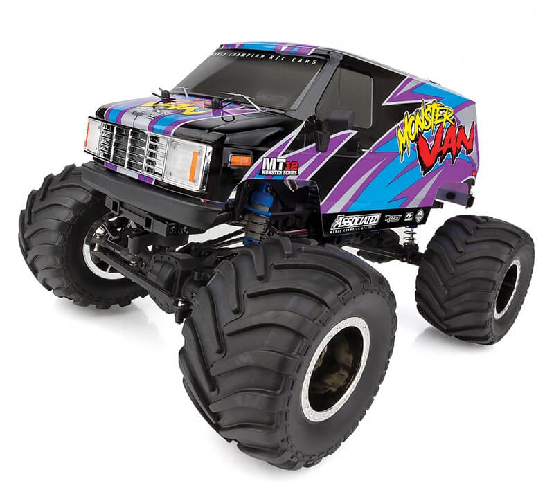 Designed not only for scale looks with realistic chrome wheels, chevron-style tires, and retro-styled van body, the MT12 is built for car-stomping action as well. The steel ladder frame chassis provides the perfect backbone for this rugged little monster. The 4-link suspension, threaded shocks, and soft rubber tires give the grip and performance needed to smash over cars or through dirt and mud. Transferring power to the ground is a compact 3-gear transmission, plastic low-friction slider-type drive shafts, front steel CVA axles, and metal-shield ball bearings.