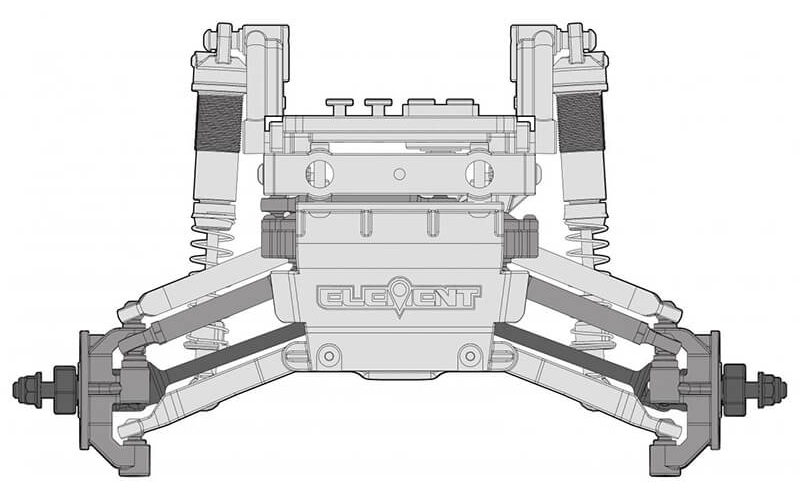 Suspension: Symmetrical upper and lower arms along with flipped lower pivot ball mount allow for more travel and 45 deg. steering throw.