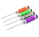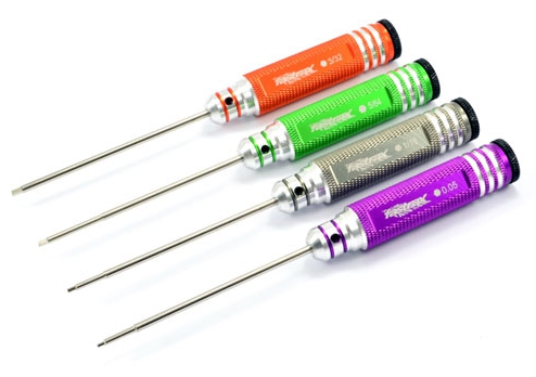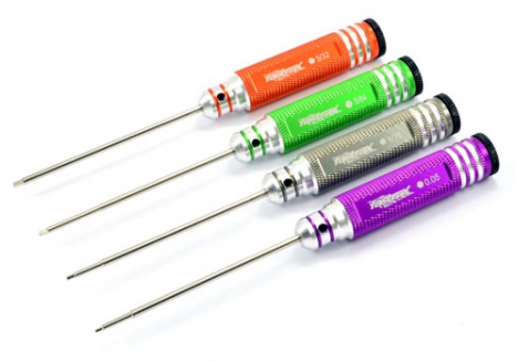 Inexpensive set with aluminium machined and anodised handles. Hard bit. Four metric sizes - 0.050, 1/16, 5/64, 3/32