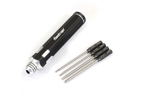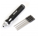 One handle, four wrenches! This space saving tool is ideal for those not wishing to cart the tool box around. The hollow aluminium handle houses .050", 1.16", 5/64" and 3/32" hex wrench bits. Simply select the one you want and slide into the spring clamp holder in the end.