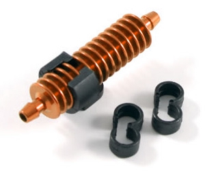 The Exhaust Gas Cooler is mounted between the tuned pipe and the fuel tank and so it will take away some heat from the exhaust gas that goes into the fueltank, lowering the temprature of the fuel and increasing the runtime. Available in a selection of colours and with additional mounting clip and fuel clips it is a must have addition for any serious racer.