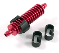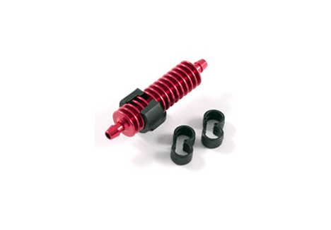The Exhaust Gas Cooler is mounted between the tuned pipe and the fuel tank and so it will take away some heat from the exhaust gas that goes into the fueltank, lowering the temprature of the fuel and increasing the runtime. Available in a selection of colours and with additional mounting clip and fuel clips it is a must have addition for any serious racer.