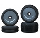 The METHOD RC NitraGrip Striped Narrow Front & Nano Stud Rear Nitrile Rubber Tire Set is specially designed for the 1/24 scale Micro-B buggy platform, delivering exceptional performance on a variety of indoor and outdoor surfaces. Made from premium nitrile rubber — a signature material of the NitraGrip series — these tires offer excellent durability and superior grip, tailored specifically for small-scale buggy racing.