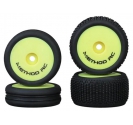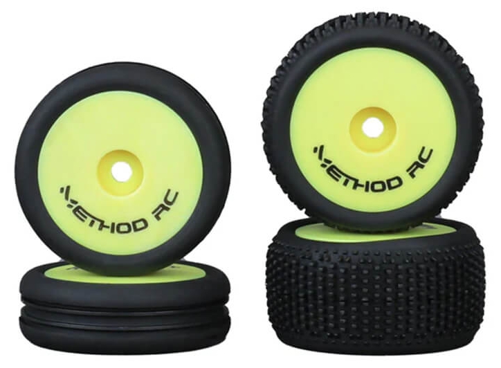 The METHOD RC NitraGrip Striped Narrow Front & Nano Stud Rear Nitrile Rubber Tire Set is specially designed for the 1/24 scale Micro-B buggy platform, delivering exceptional performance on a variety of indoor and outdoor surfaces. Made from premium nitrile rubber — a signature material of the NitraGrip series — these tires offer excellent durability and superior grip, tailored specifically for small-scale buggy racing.