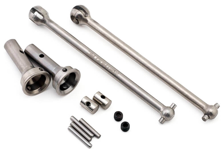 Let's face it, titanium on titanium is a recipe for disaster. The friction created between like metals, especially titanium, causes a horrific galling that makes the corn on your grandma's feet seem like a walk in the park. To counteract this galling, hardened steel pins and yokes create a buffer between the stub axle/axle shaft and the outdrive cups/CVD pin making this truly a hybrid system. This marriage of two types of materials makes for a long lasting/symbiotic relationship that Taylor Swift couldn't comprehend. The end result is a nearly 20% weight loss of rotating mass that's easier to assemble and install than a 1984 6-geared Team Associated RC10 transmission.