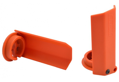 RPM Shock Shaft Guards are a simple design, replacing stock shock spring cups with ones that have mounting holes for a thin but tough shield that rises up to the base of the shock body. The guard completely blocks debris from striking the shock shaft. The back and sides are open, which prevents debris from building inside the guard as well.