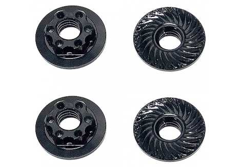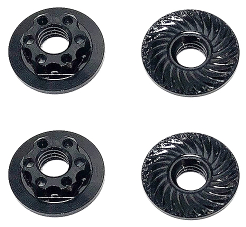 The Factory Team M4 Low Profile Wheel Nut is designed to fit on the front of car models (example: B74, B64, TLR 22, TLR 22-4, Tekno EB410, Yokomo YZ-4 SF) that require a thin nut to maintain the legal width limit at major events. With large-diameter locking serrations, these wheel nuts "bite" into the face of the wheel to create a secure hold.
