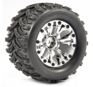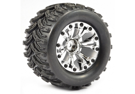 Suitable for most 1:10 Monster trucks with 12mm Hex fit and 5mm axle. Sold as pair. (Chrome only)
