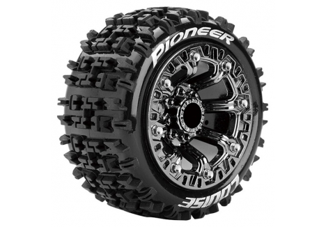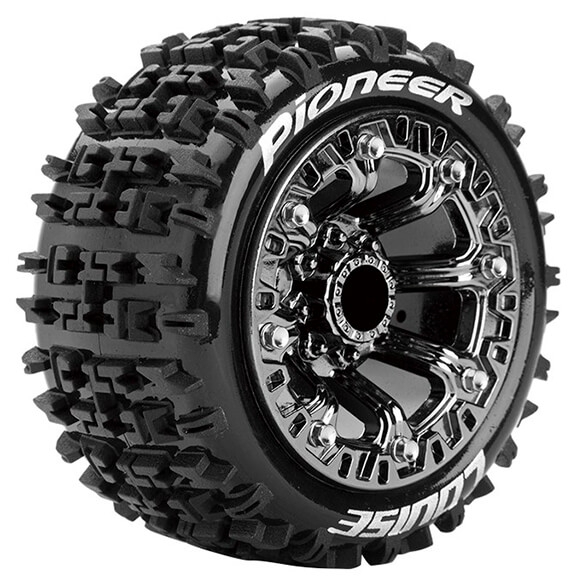 Series: ST-PioneerCompound: SoftColour: Black ChromeHex Fitment: 12mmFits: 1/16 Stadium Truck, E-Revo FR/R, Summit FR/R, Savage XS Flux FR/RTyre Width: 43.5mmTyre Diameter: 90mmWheel Offset: TBCIncludes Insert: YesGlued: Yes