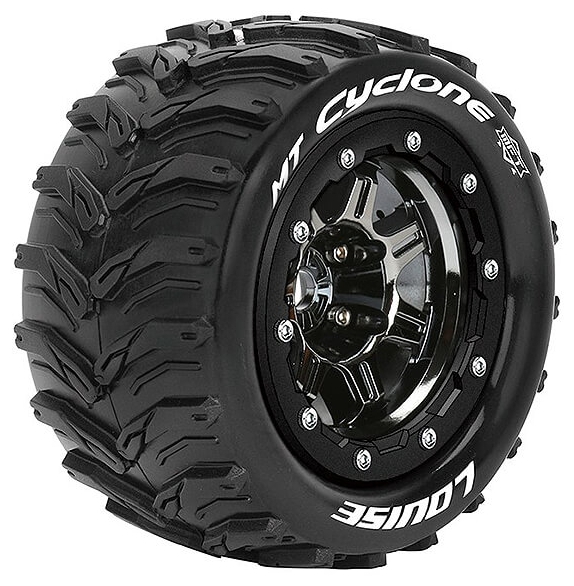 Series: MT-CycloneCompound: SoftColour: Black ChromeHex Fitment: 17mmFits: T-Maxx Monster TruckTyre Width: 70.2mmTyre Diameter: 136.9mmWheel Offset: 1/2"Includes Insert: YesGlued: Yes