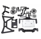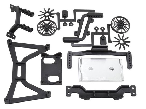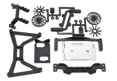We completely eliminate the through-the-body posts that destroy the scale looks of your Slash. We do this via an ingenious body mount system that uses a scale, mock radiator out back and four unobtrusive screws out front that hide an under-body frame. What’s visible on the outside is an ultra-cool, scale radiator (based off of a full-sized desert truck radiator), complete with mock fan blades and fan shrouds (also based off of their full-sized counterpart). The fan shrouds are the key to this clever mounting system because the fan shrouds are the locking mechanisms that lock the body in place! Simply slip the front under-body frame into the adjustable catch up front, then drop the hidden locks below the radiator out back into the lock plate and rotate the fan shrouds until they lock in place. Simple, inventive, RPM strong and extremely scale!