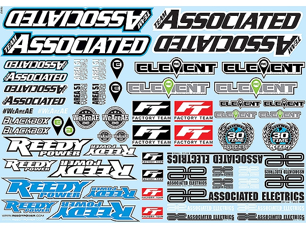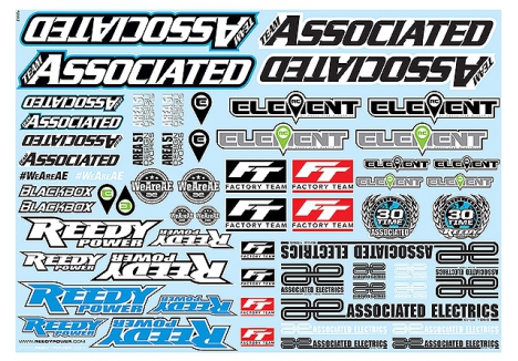 This full-color decal sheet features all our current Associated Electrics brands: Team Associated, Reedy Power, Factory Team, and Element RC. Different variations of the brand logos are also included, with some bonus logos.