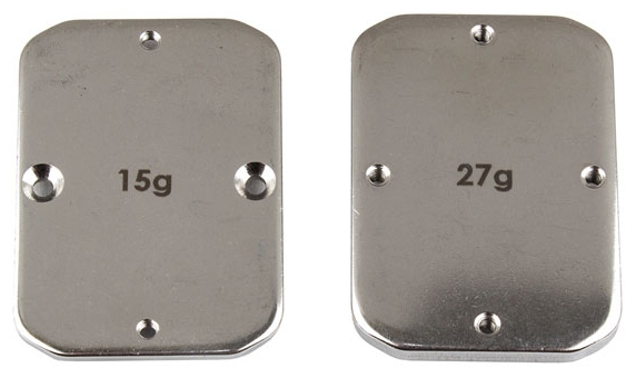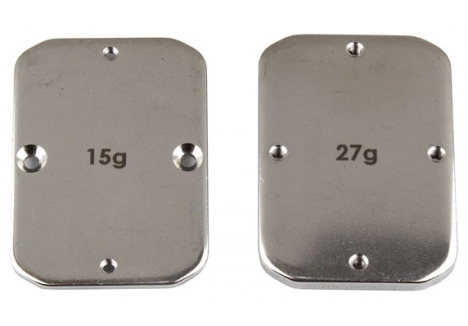 These 15 gram and 27 gram chassis weights key into the front chassis pocket. Adds weight to the front of the B64 and B64D, giving more steering in high-grip applications. Mounting hardware included.