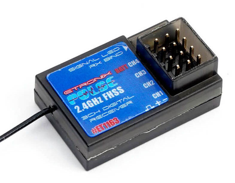 Model: ET1163 (compatible) Channels: 4 Frequency: 2.4GHz FHSS Input Voltage: 4.8 – 6.0V Failsafe: Supported (Configurable throttle position) Antenna Length: 26mm