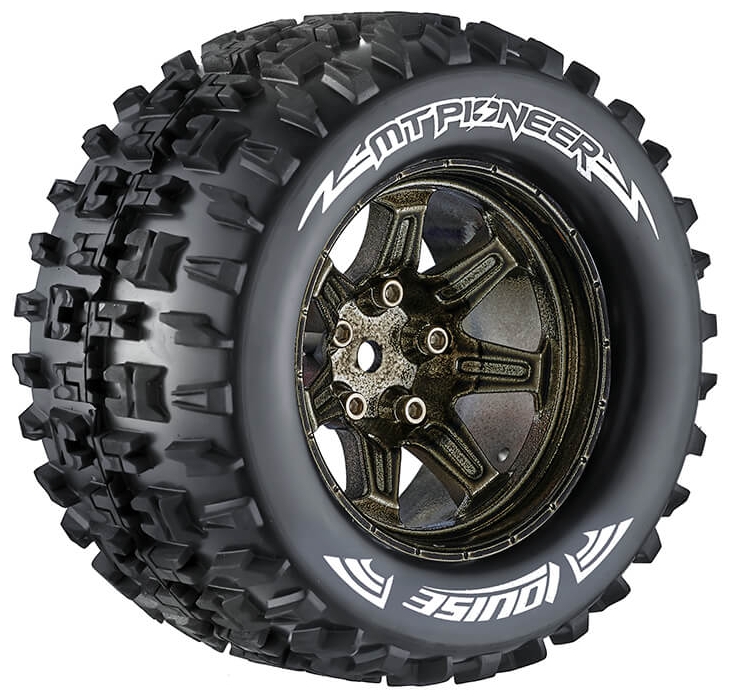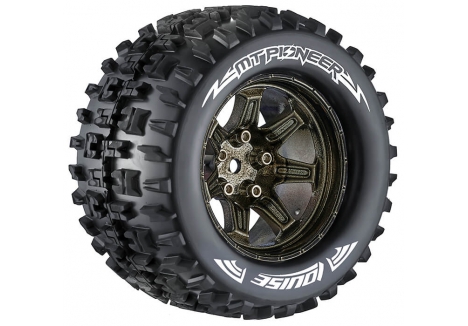 Series: MT-PioneerCompound: SoftColour: Black ChromeHex Fitment: 14mmFits: 1/10 Monster Truck, Granite 4x4Tyre Width: 69.4mmTyre Diameter: 119.5mmWheel Offset: TBCIncludes Insert: YesGlued: Yes