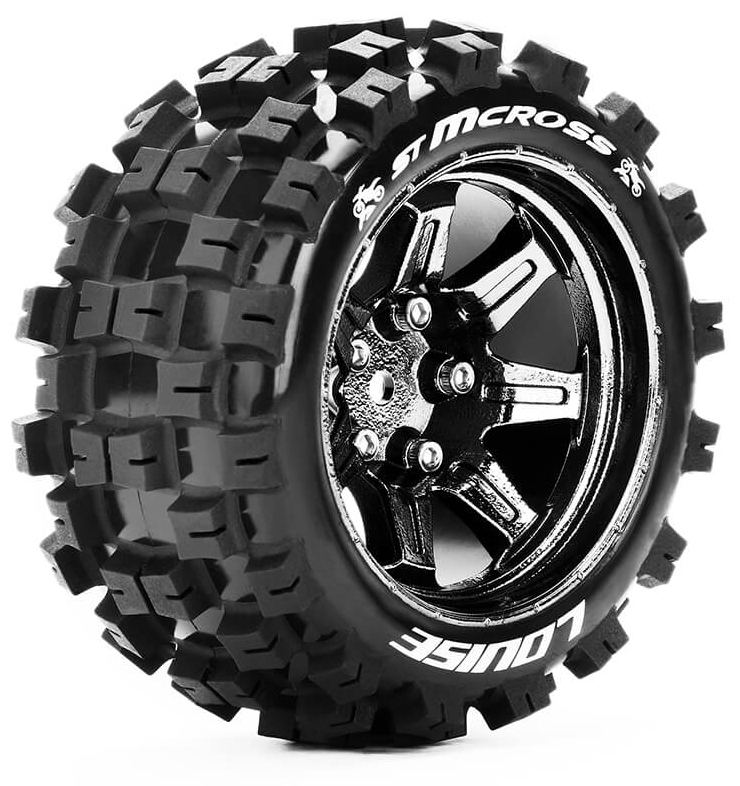 Series: ST-McrossCompound: SoftColour: Black ChromeHex Fitment: 14mmFits: 1/10 Stadium Truck, Granite 4x4Tyre Width: 52.0mmTyre Diameter: 105.3mmWheel Offset: TBCIncludes Insert: YesGlued: Yes