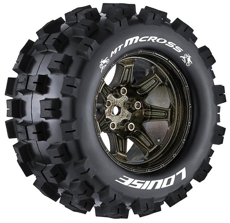 Series: MT-McrossCompound: SoftColour: Black ChromeHex Fitment: 14mmFits: 1/10 Monster Truck, Granite 4x4Tyre Width: 52.0mmTyre Diameter: 103.2mmWheel Offset: TBCIncludes Insert: YesGlued: Yes