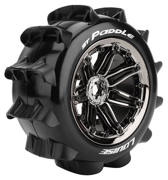 The stadium truck tyres are about 20mm more narrow than the Monster truck tyres. The outer diameter is similar. The stadium truck tyres have the advantage to be lighter and to reduce the load on the transmission as well as on the suspension.