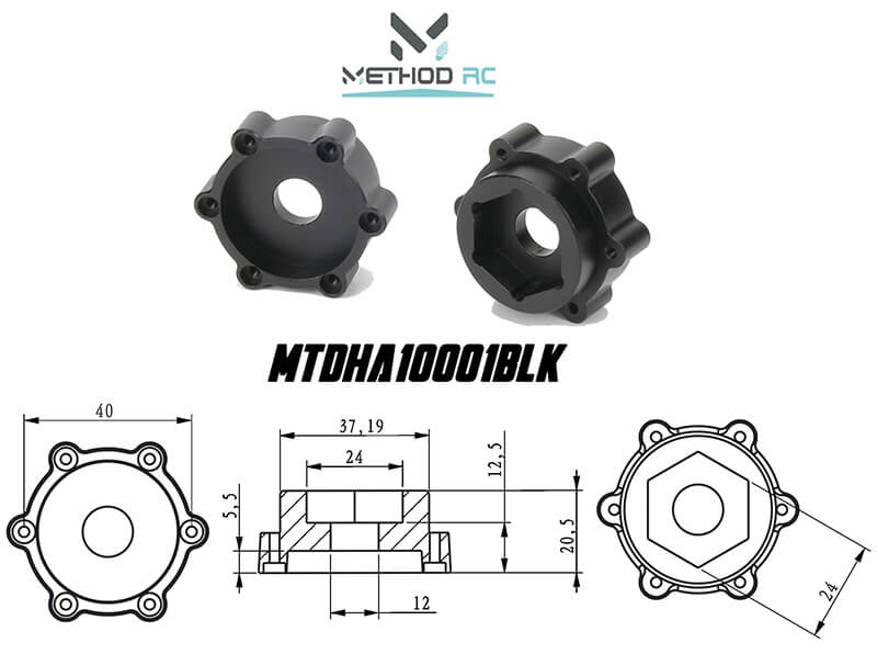 The 6 x 40mm / 12.5mm Offset 24mm Hex works in unison with our 1/5th Array 6 x 40mm bolt pattern wheel. This particular offset works perfect for adapting the 1/5th Terraform Belt Equipped tire MTD1000 to an X-MAXX. More wheel options including standalone wheels and tires will be available in the future.