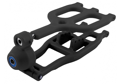 The RPM True-Track Rear A-arm Conversion kit eliminates one of the biggest headaches associated with the incredibly popular Maxx line of trucks. Rear toe angles are nearly impossible to set accurately and there isn't a gauge currently made that can tell the T-Maxx / E-Maxx owner if each individual wheel's toe angle is set correctly in relation to the chassis. Our rear end kit completely eliminates the rear toe link, locking in the rear toe angle at a solid negative 1.5 degrees per side for a total rear toe of negative 3 degrees (of Toe-In), effectively eliminating rear bump steer! Our design retains the stock upper pivot ball in the RPM axle carrier to allow precise camber adjustments while the lower pivot ball has been eliminated in favor of a rock-solid, beefy 4mm diameter hinge pin that locks-in the rear toe angles for race winning consistency. All aspects of the RPM rear end conversion have been beefed up for rugged durability and slop free movement throughout its range of travel. We've completely redesigned the rear end yet all stock suspension geometry has been retained. Additionally, we've incorporated our oversized bearings (3mm larger in diameter than stock) into the design, providing 2mm more bearing contact with the axle while doubling the bearing load rating & tripling the fatigue rating over stock bearings. So does all this add weight? Not a single gram! The entire RPM rear end kit weighs in at exactly the same as the stock components that are replaced!