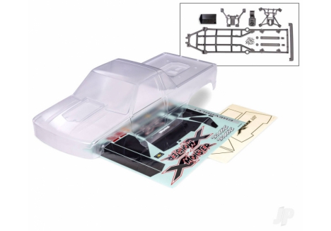 The heavy duty X-Monster Chevrolet GMT400 CK body is made from thick 2 mm polycarbonate for increased durability. The clear body comes fully trimmed and ready to paint with decal sheets, window masking, and pre-applied overspray film. Includes inner cage, clipless body latches, body reinforcements, and mounting hardware.