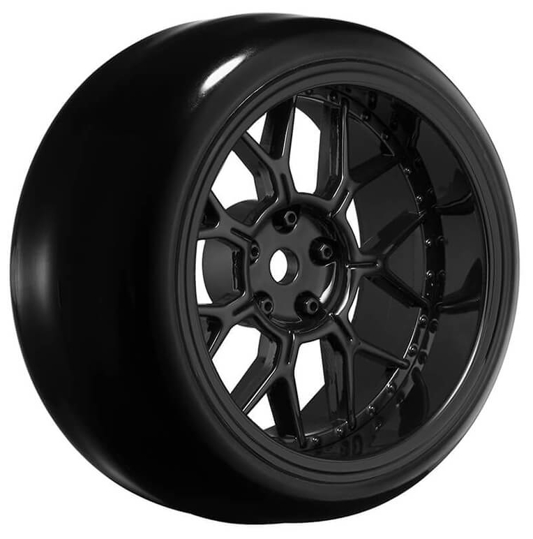 LOUISE RC 1/10 DRIFT 2,4,6,8MM OFFSET 14-SPOKE WHEELS GLOSS BLACK WITH TYRES LNHA566T