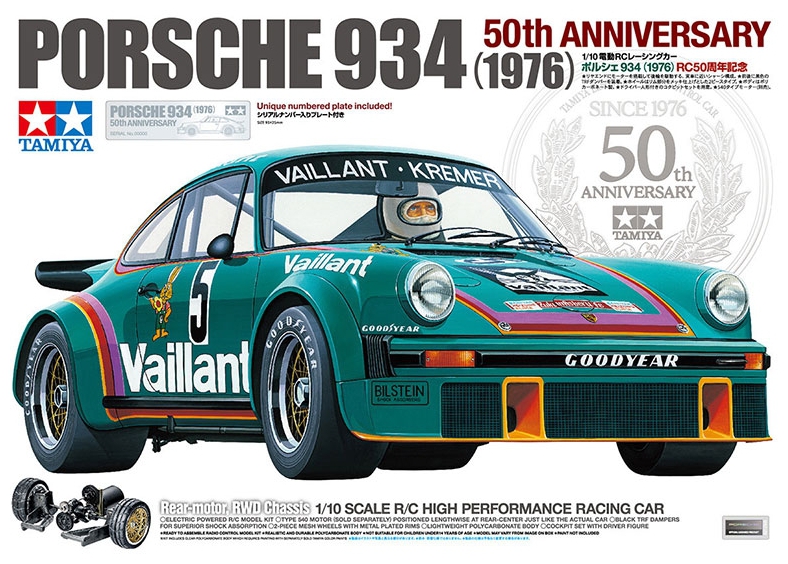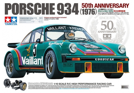 To celebrate the 50th anniversary of Tamiya’s first R/C model Porsche 934, this incredibly special limited-edition kit recreates the iconic Porsche 934 with a bespoke chassis featuring the motor positioned lengthwise at rear-center which powers the rear wheels just like the actual car. For collectors and shelf queen connoisseurs, magnetized body mounts (needing no body holes) are included for those who want to just display the R/C car as a model! A unique numbered plate is included to make each individual kit special.