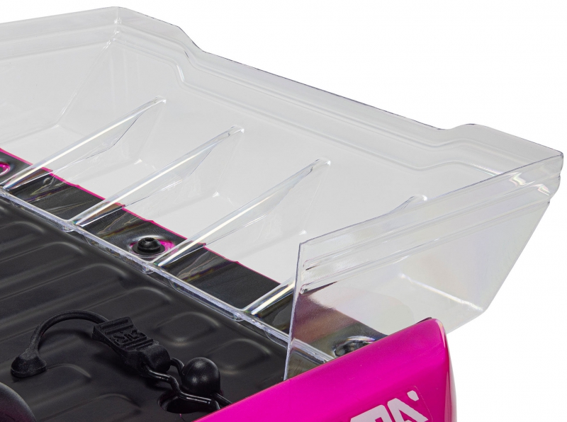 Under the aggressive Infraction body sits a re-engineered drivetrain. Metal-geared 37T 1.35 MOD differentials, steel input gears, and dual rubber-sealed bearings throughout mean this platform is built to absorb punishment run after run. The transmission overload coupling handles shock loads and protects your gears without requiring any slipper clutch tuning. All you need to do is bash and let the system take care of itself. It means you get cleaner launches on high-grip asphalt with fewer blown diffs.