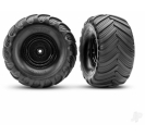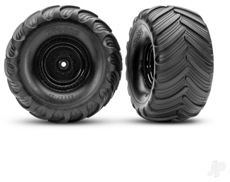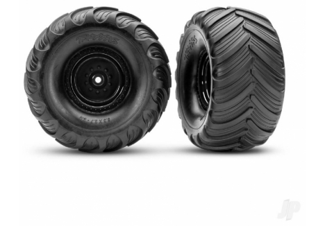 Terra Groove tires replicate the "hand carved" look of full-size monster truck treads. The tough rubber compound hooks up for maximum acceleration and great grip on a wide variety of surfaces including dirt, grass, pavement, and rocks. The tires come mounted with foam inserts and pre-glued to deep-dish black wheels with bead-lock detailing. Fits 12 mm hex, 2WD electric rear.