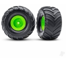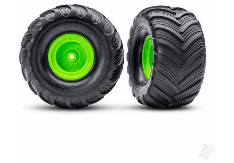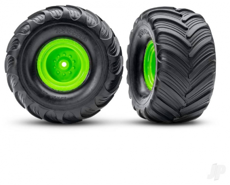 Terra Groove tires replicate the "hand carved" look of full-size monster truck treads. The tough rubber compound hooks up for maximum acceleration and great grip on a wide variety of surfaces including dirt, grass, pavement, and rocks. The tires come mounted with foam inserts and pre-glued to deep-dish green wheels with bead-lock detailing. Fits 12 mm hex, 2WD electric rear.