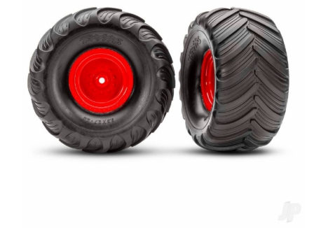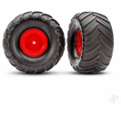 Terra Groove tires replicate the "hand carved" look of full-size monster truck treads. The tough rubber compound hooks up for maximum acceleration and great grip on a wide variety of surfaces including dirt, grass, pavement, and rocks. The tires come mounted with foam inserts and pre-glued to deep-dish red wheels with bead-lock detailing. Fits 12 mm hex, 2WD electric rear.