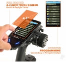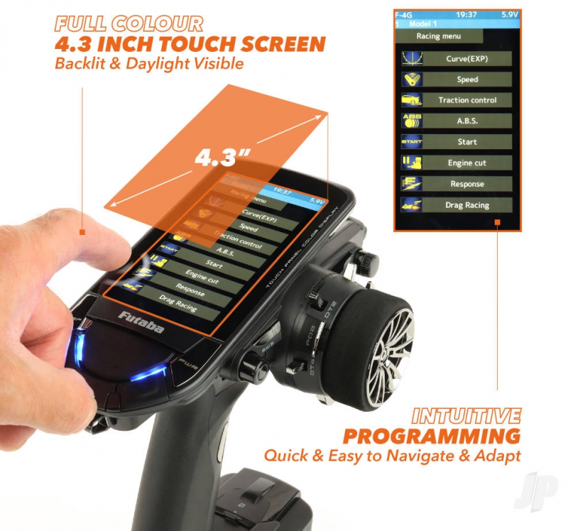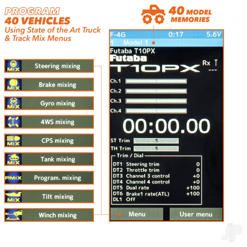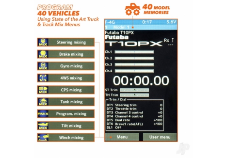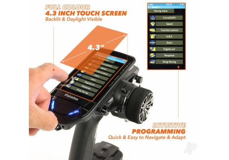 Powered by Futabas ultra-fast 4th generation F-4G telemetry system, there's lightning-fast response here and near-zero latency, giving you the critical edge on track. Meanwhile, the PX's 10-channel capability is paired with an impressive 40 model memory, allowing you to manage all the vehicles you need with total ease, from 1/8 nitro buggies to electric touring cars, trucks, tanks and and everything in between. But, of course, theres more. Boasting 4.3 inches of vibrant full-colour, the touchscreen delivers an intuitive and highly responsive interface, giving you full control over advanced settings such as throttle curves, dual rates and telemetry readouts. Among its standout features are dedicated truck and track mix menus, designed specifically for managing multi-axle vehicles or dual-motor crawlers, as well as fine-tuning traction and balance across different surfaces – ideal for competitive off-road drivers who demand adaptability across disciplines.