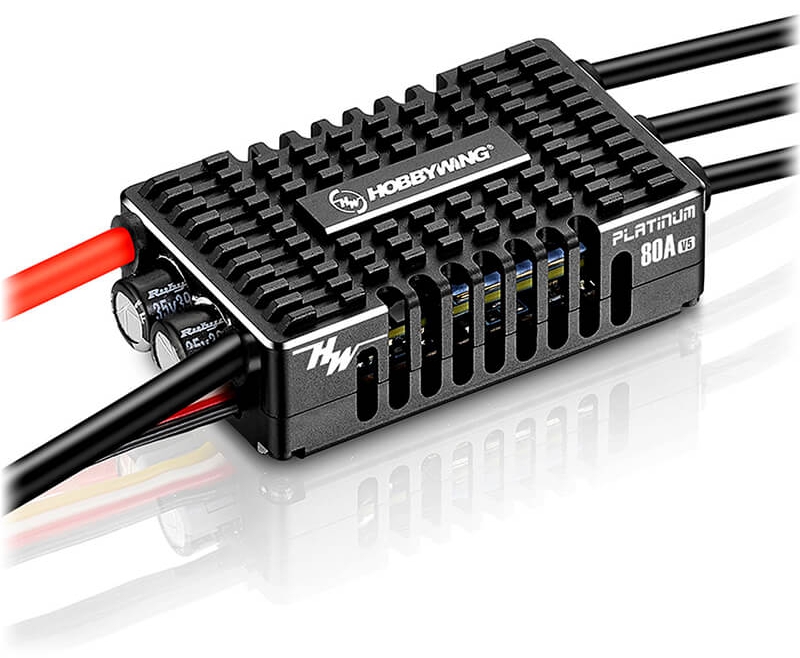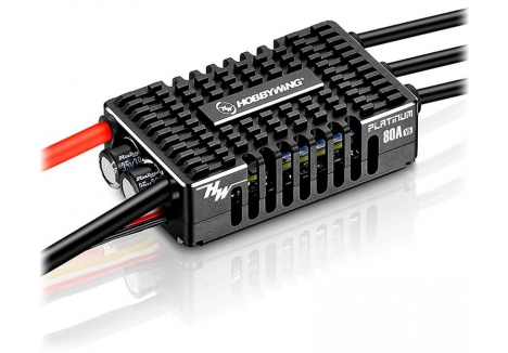 The Platinum V5 80A V5 is an extremely powerful ESC with 5-12V switch BEC suitable for 325420 helicopters and fixed-wing. This is ensured by the built-in 32-bit processor in combination with a specially developed algorithm for RPM accuracy, which clearly sets the performance of the controller apart from similar controllers on the market. In addition to the algorithm, the Platinum V5 with 80A is equipped with various protocols that allow different transmitter systems to read the data from the ESC. These include, for example, the Mikado VBar system and Futaba S.BUS2.