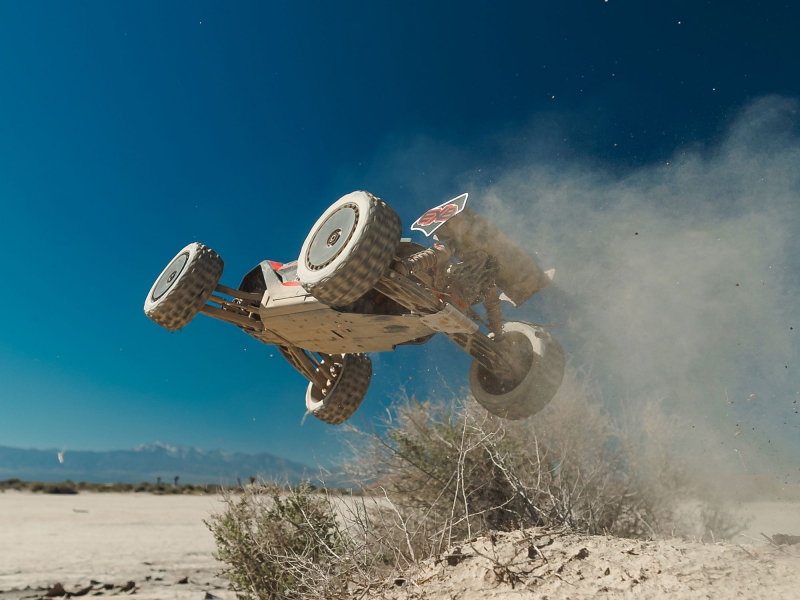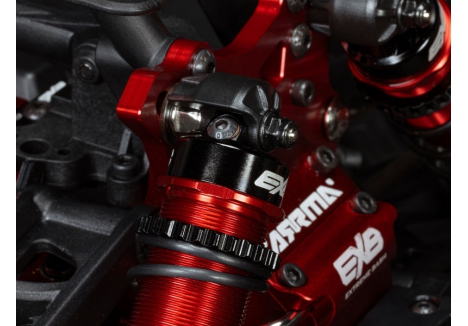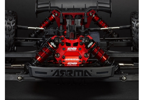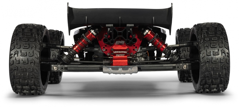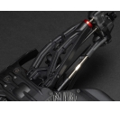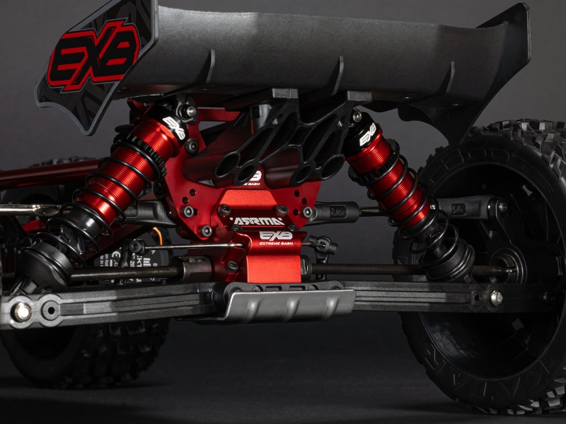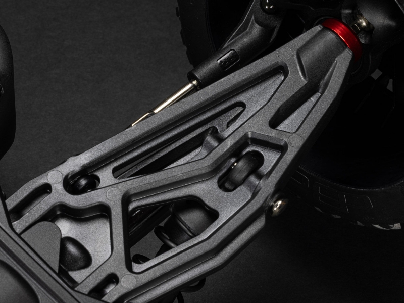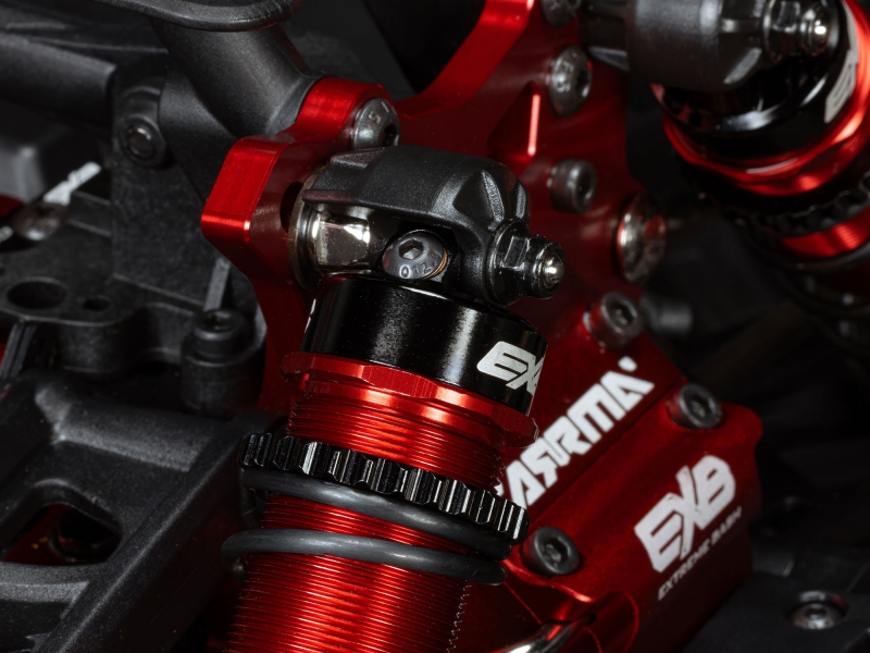 - Tuned Oil-Filled Adjustable Shock Absorbers — The independently mounted, oil-filled coil-over suspension shocks are housed in EXB 7075 T6 aluminium towers front and rear, with adjustable spring preload and damping to tune handling characteristics for different driving styles and terrain conditions. These shocks absorb impacts from jumps and rough terrain whilst maintaining consistent ride height and vehicle control at extreme speeds.
