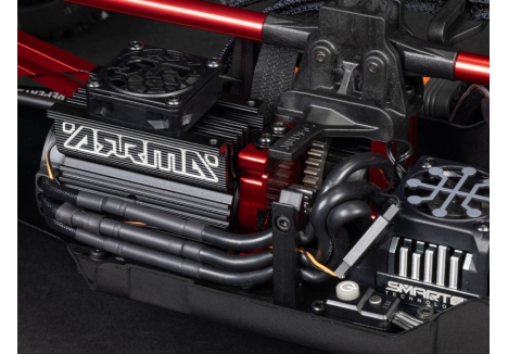 - Spektrum Firma 4074 2050Kv Brushless Motor — This premium brushless motor combines high RPM capability with mechanical durability. The ARRMA-designed heatsink and integrated cooling fan manage thermal load during sustained high-speed running, preventing performance degradation from overheating. The 2050Kv rating delivers the balance between raw speed and torque needed for speed bashing and acceleration performance.